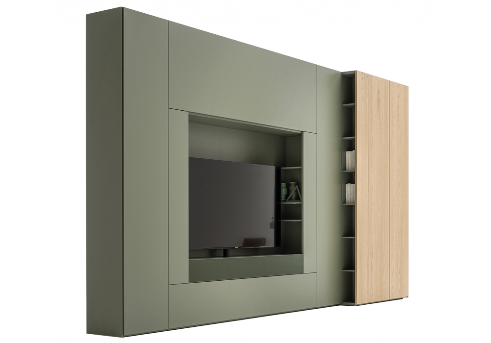 Core firmato da R&D Caccaro per Caccaro è un sistema modulare con apertura scorrevole e porta tv, la nicchia attrezzata al centro del modulo si trasforma in uno spazio totalmente dedicato alla tecnologia che accoglie il televisore e nasconde cavi. Disponibile in differenti finiture e dimensioni.