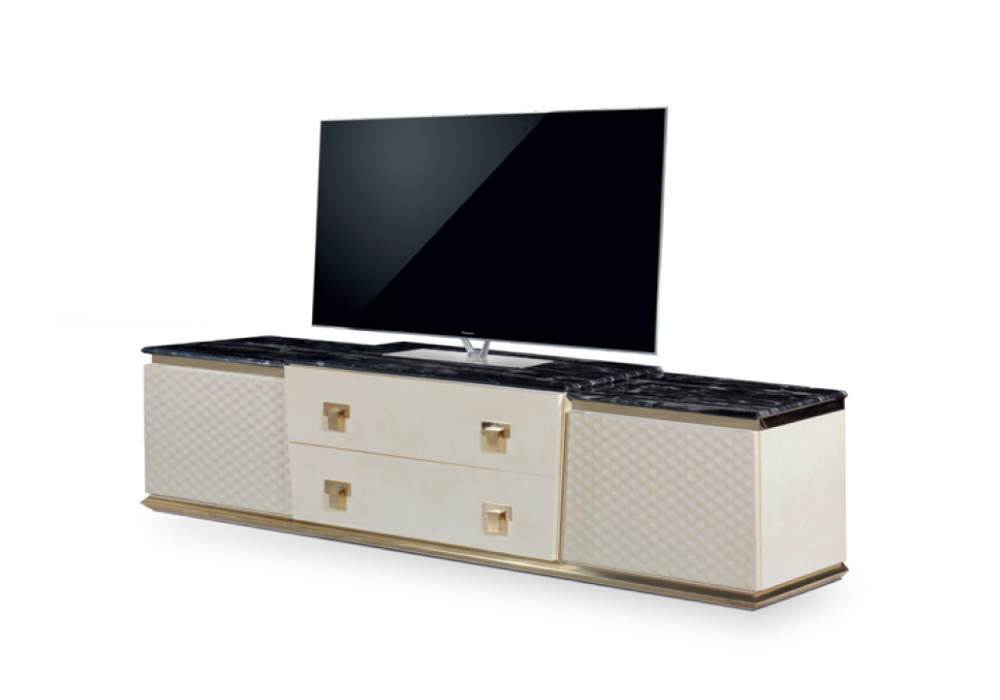 Vogue firmato da Andrea Bonini per Turri è un mobile TV con struttura in MDF, multistrato e pannelli di particelle di legno in finitura laccata lucida. Piano in marmo o legno. Ante rivestite in pelle ricamata con motivo esagonale all' esterno e liscia all'interno.