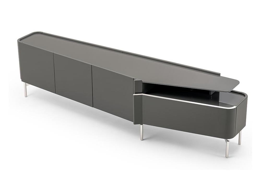 Zenit firmato da Andrea Bonini per Turri è un mobile TV con struttura in MDF e multistrato in finitura poliestere laccato lucido e rivestimento in pelle. Sono presenti tre vani interni dotati e un vano a giorno con passacavo. Tre ante in legno in finitura laccata monocolore ed un cassetto con rivestimento interno in microfibra.