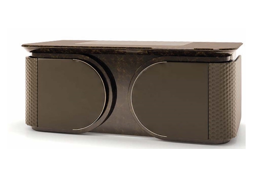 Vogue firmata da Andrea Bonini per Turri è una scrivania con struttura in MDF, multistrato e pannelli di particelle di legno in finitura laccato lucido con rivestimento in pelle ricamata. Disponibile nella versione con frontale aperto o chiuso. Sul piano è presente un passacavo.