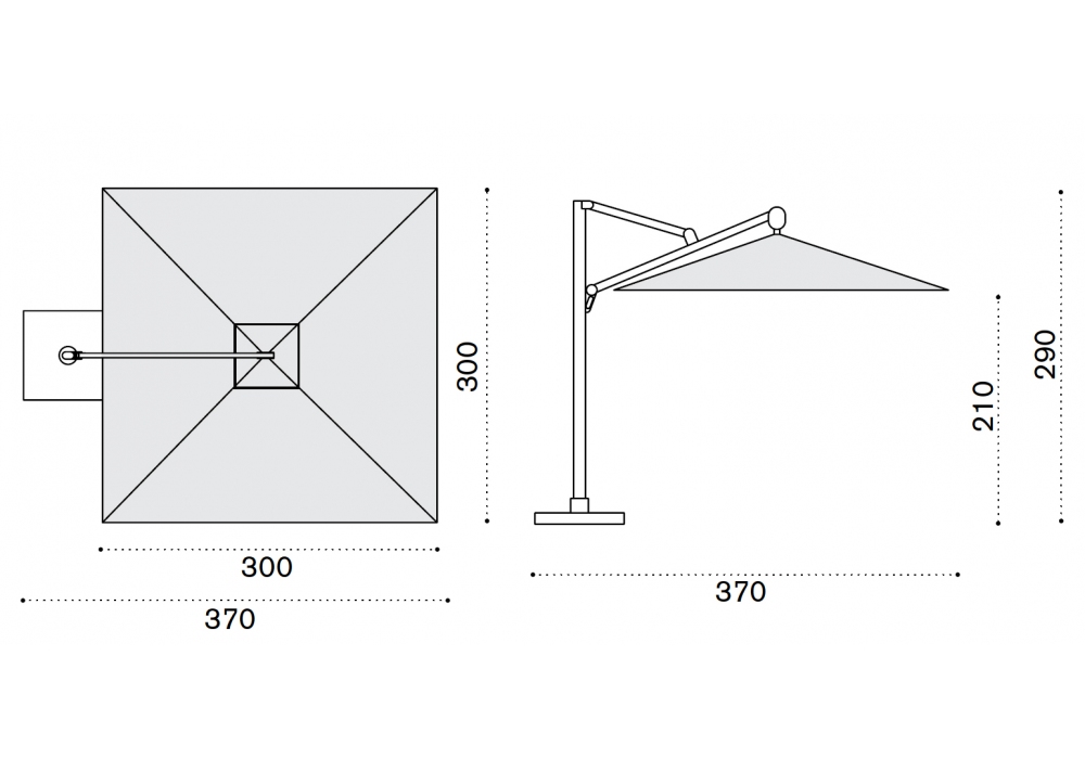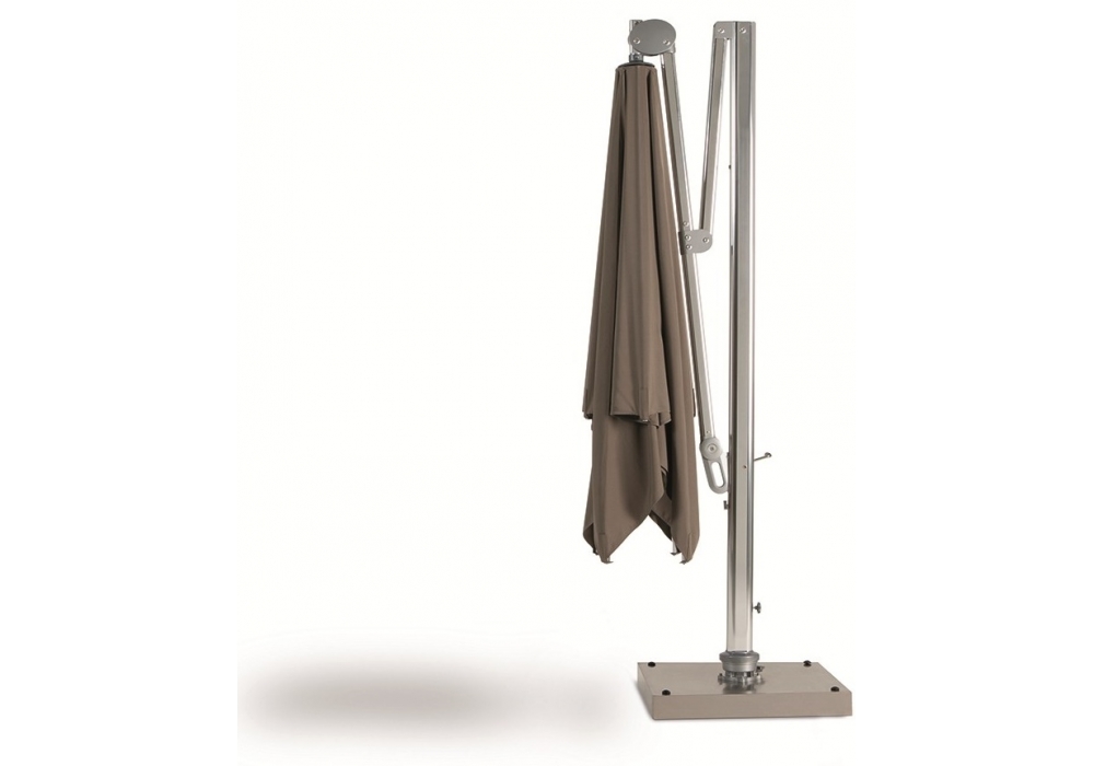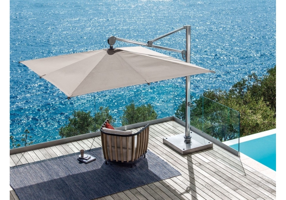 Freedom firmato da Ethimo è un ombrellone orientabile con base girevole a 360° dotata di ruote. Struttura e dettagli in alluminio anodizzato, telo in tessuto acrilico bianco o grigio tortora, di misura mt 3 x 3.