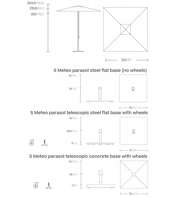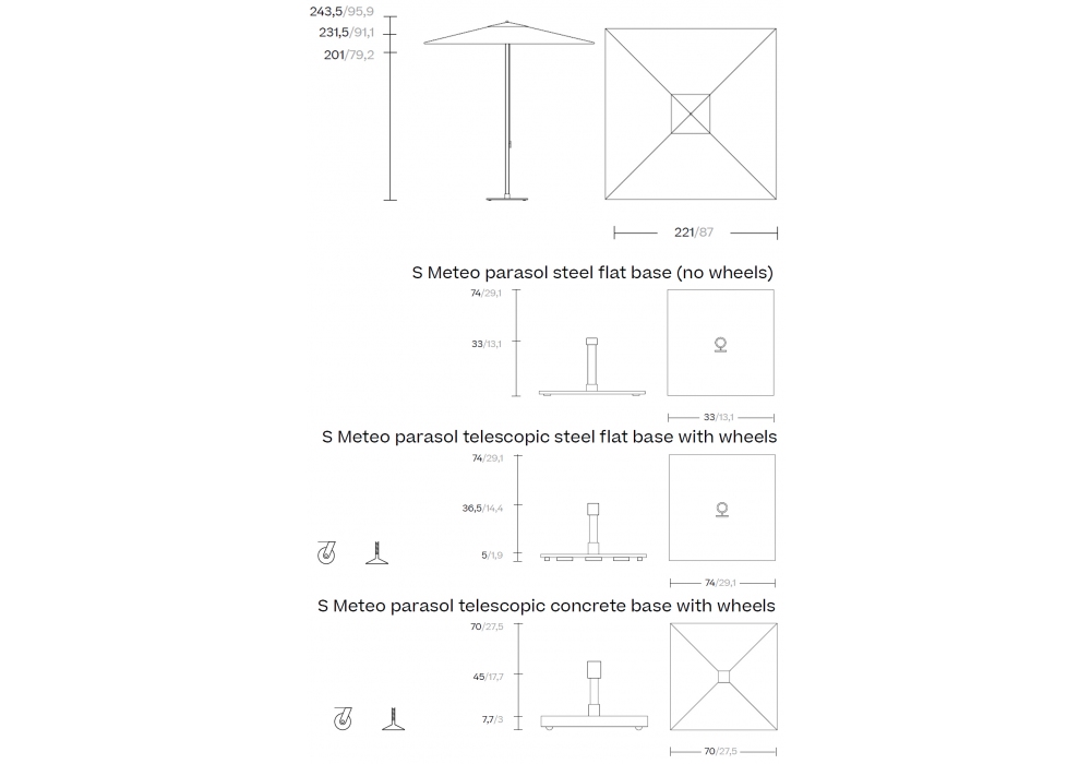Meteo firmato da Konstantin Grcic per Kettal è un ombrellone con struttura in alluminio e parasole disponibile in diversi tessuti. Disponibile anche in 3 dimensioni. Meteo è disponibile in 2 versioni: un modello base, che utilizza un sistema a puleggia manuale, e un modello di fascia alta con pistone a gas integrato per facilitare l'apertura e la chiusura dell'ombrellone. Meteo può essere montato su modelli alternativi di base.