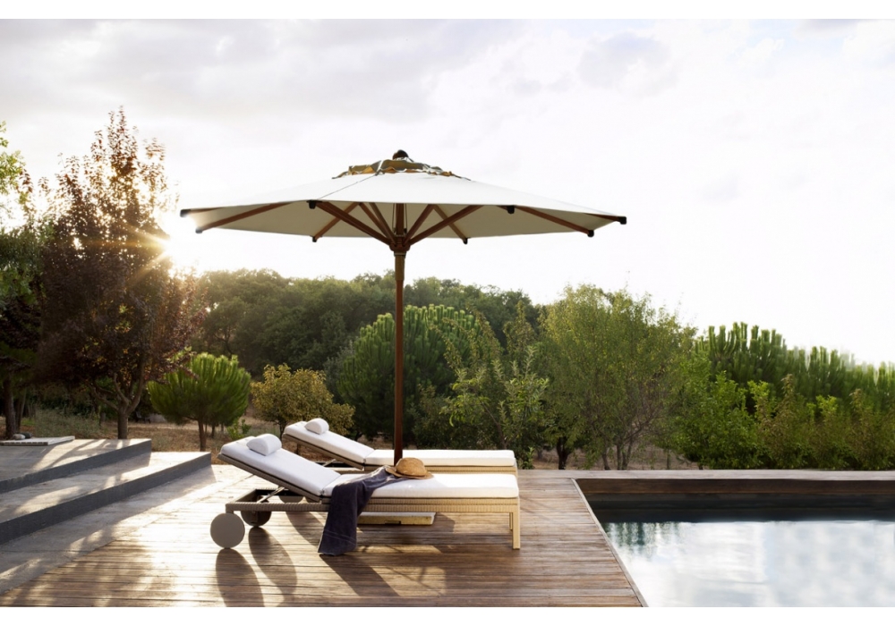 Eclipse Wood firmato per Tribù è un ombrellone con struttura in legno e parasole in tessuto in due diverse finiture. Disponibile con parasole rotondo o quadrato. E' possibile aggiungere una base in granito da supporto all'ombrellone.