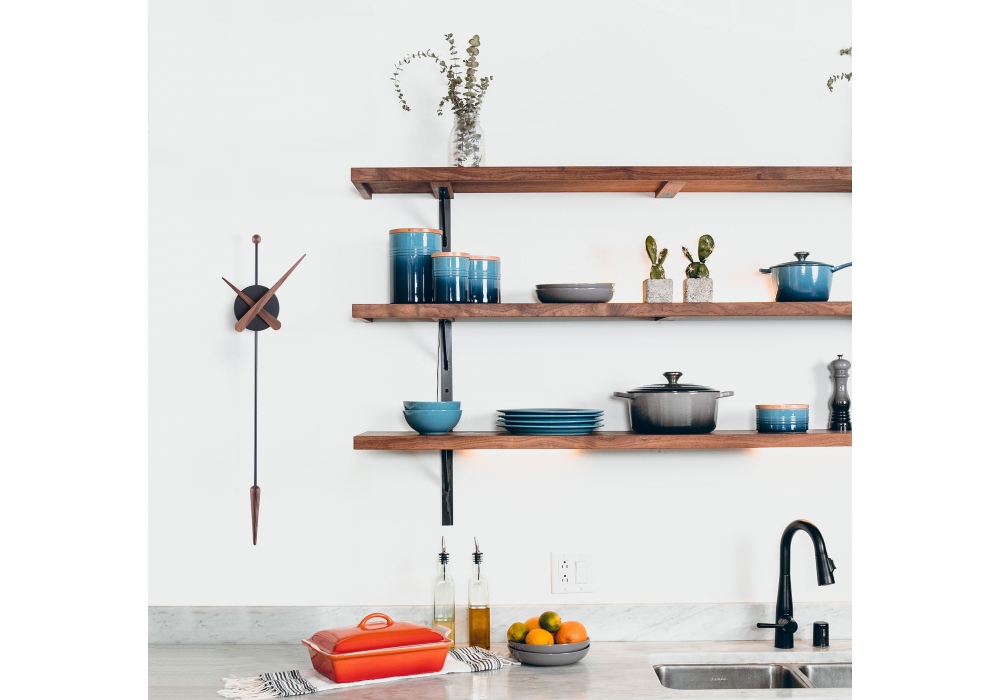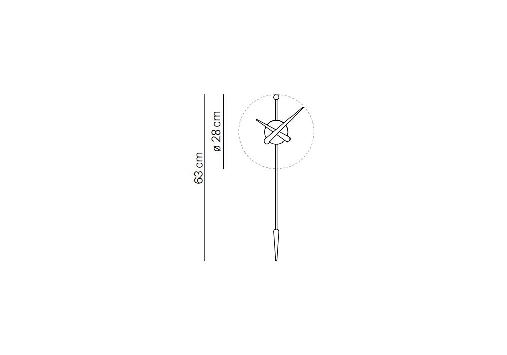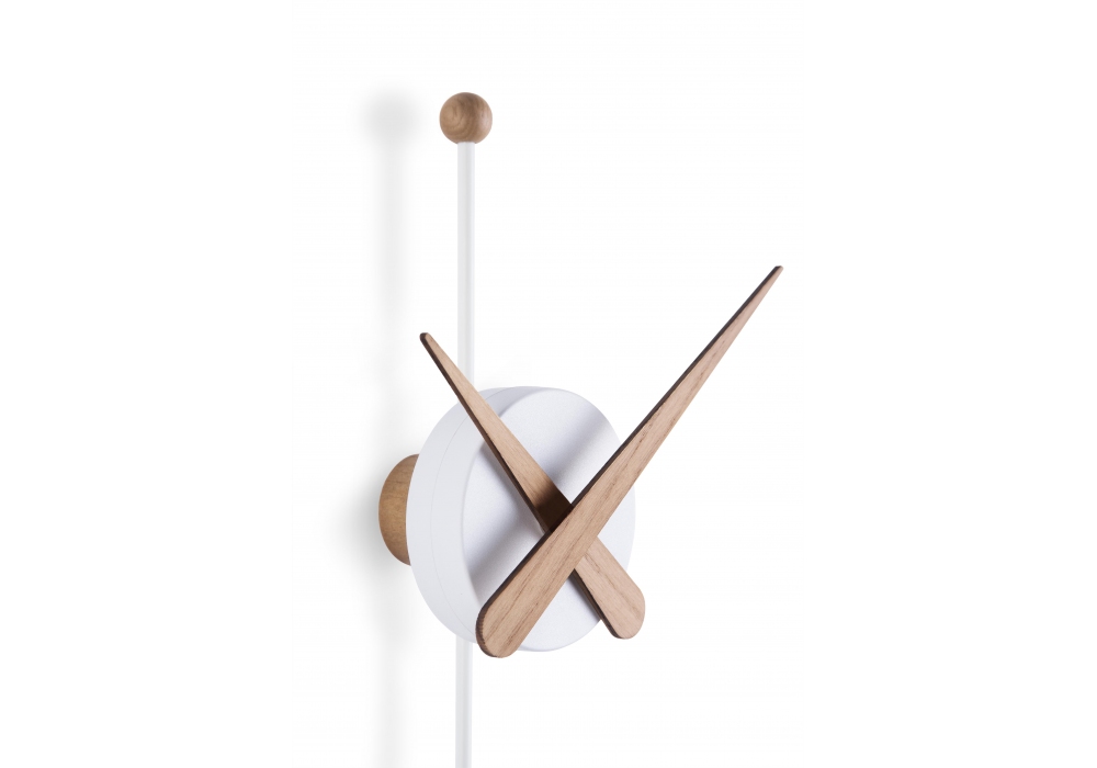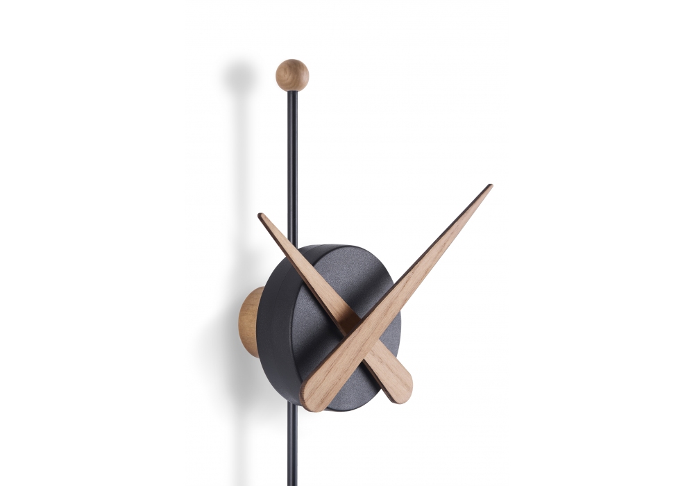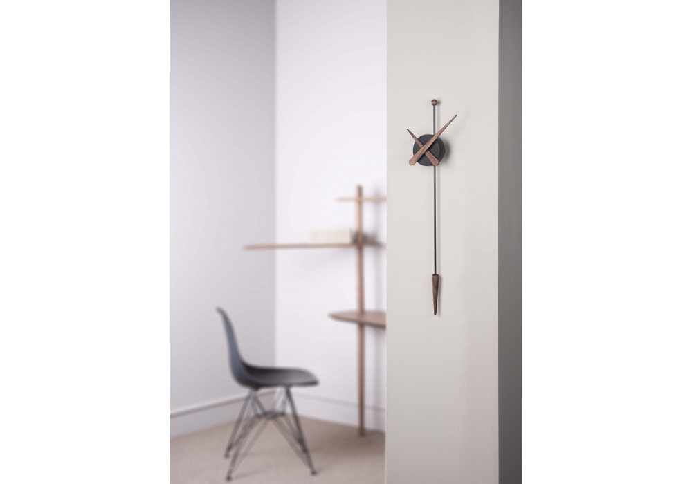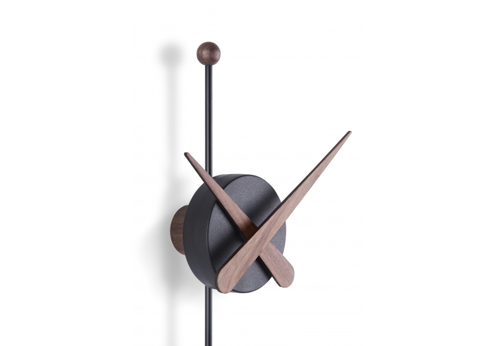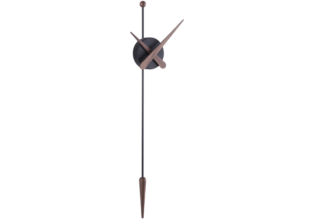 Punta firmato e prodotto da Nomon è un orologio da parete con lancette e pendolo in legno di noce o rovere, la scatola centrale è in polistirolo nero.
