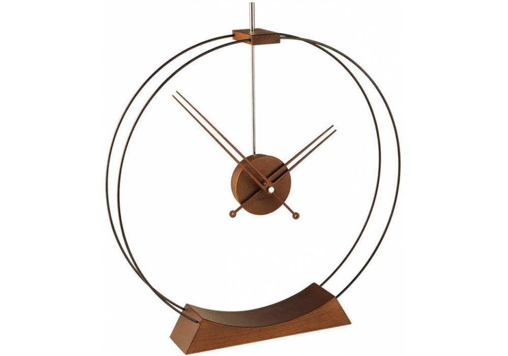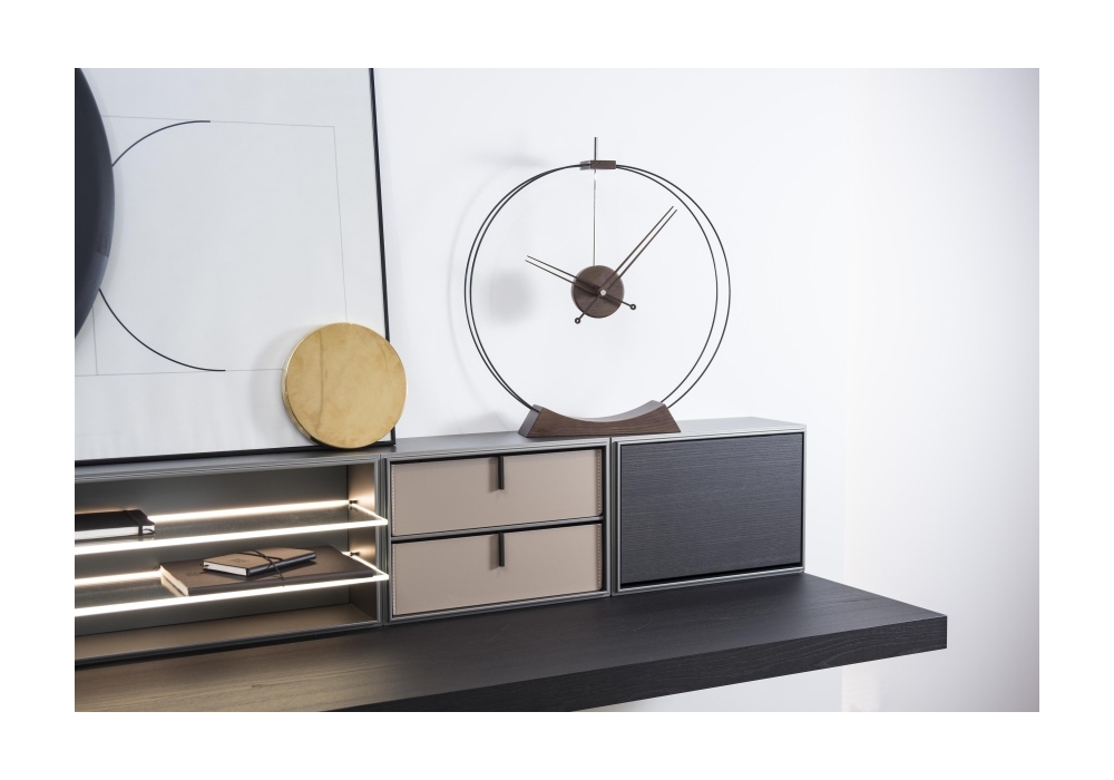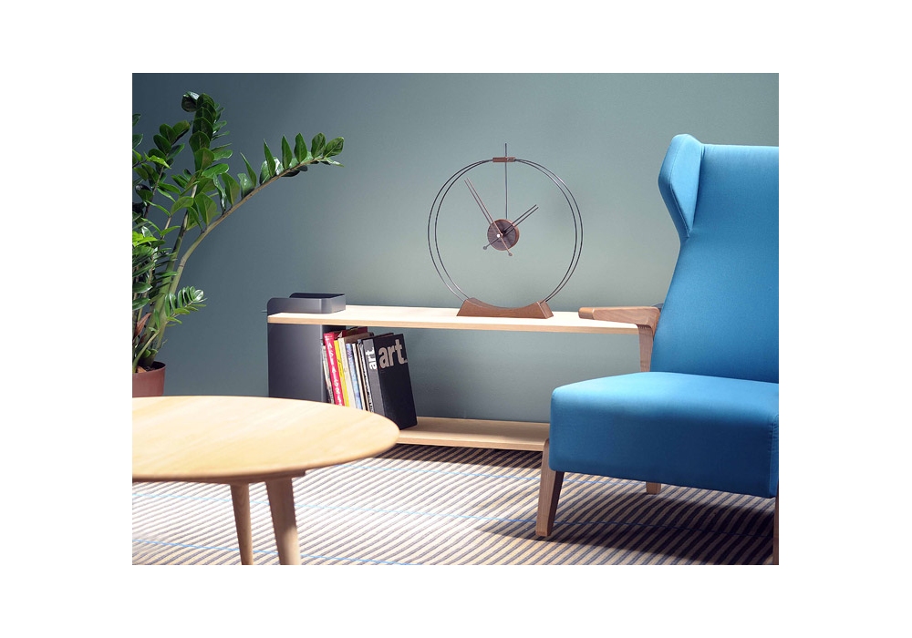 Aire firmato e prodotto da Nomon è un orologio da tavolo con anelli in fibra di vetro nera, scatola e dettagli in legno o in ottone lucido.