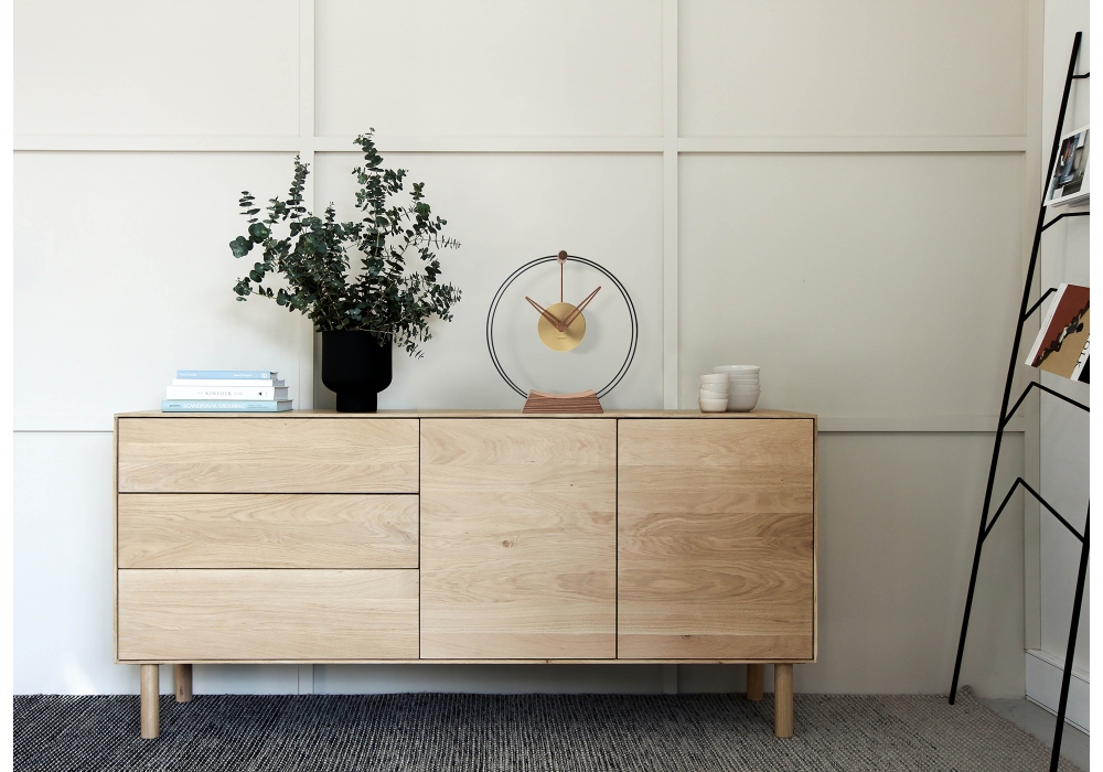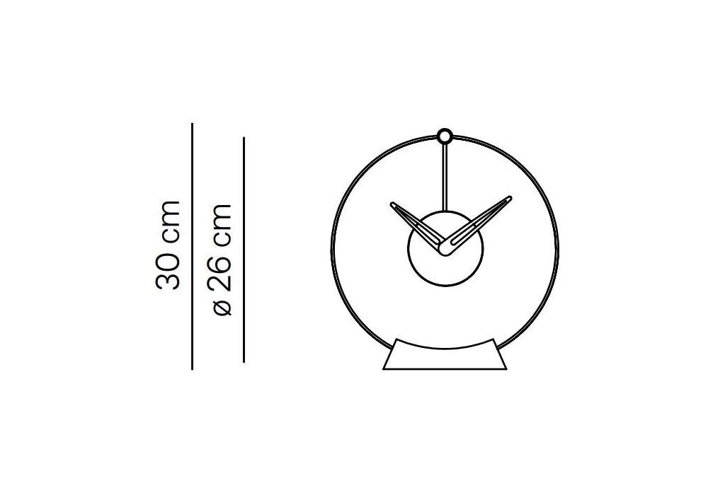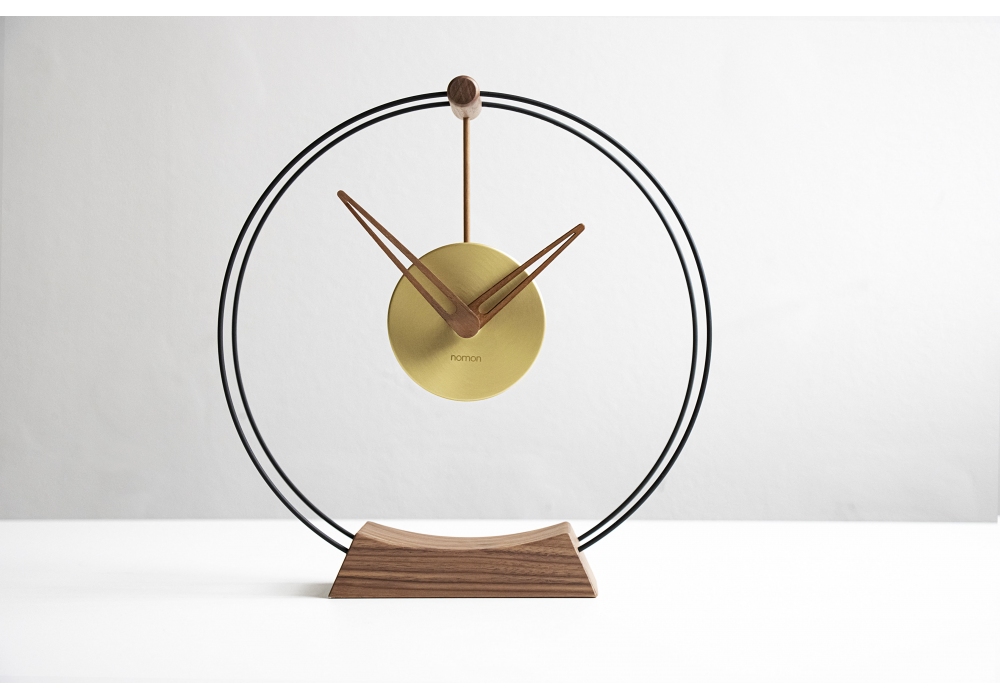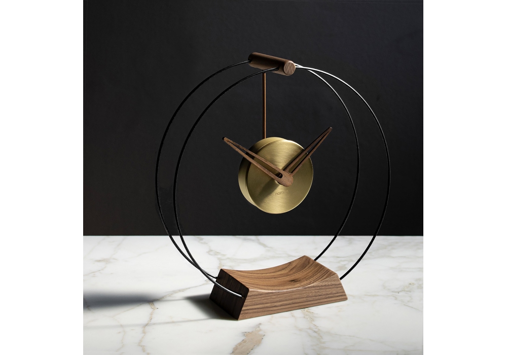 Mini Aire firmato e prodotto da Nomon è un orologio da tavolo con anelli in fibra di vetro nera, scatola in ottone lucido e dettagli in legno di noce.