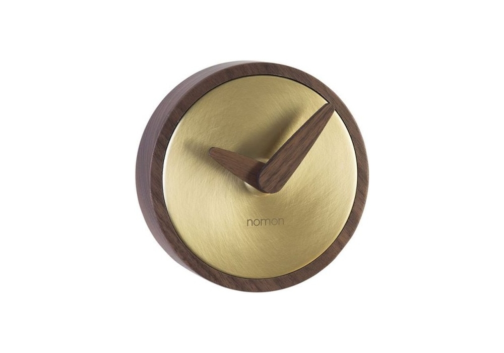 Atomo firmato e prodotto da Nomon è un orologio da parete con scatola in ottone lucido o finitura grafite, corpo e lancette in legno di noce.
