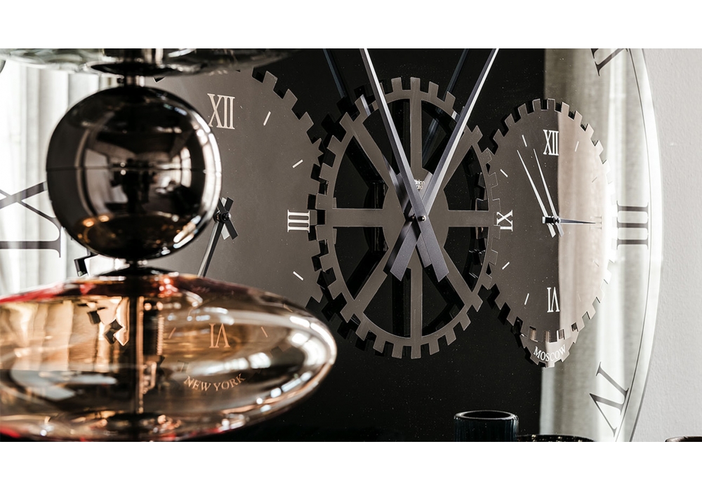 Times firmata da Andrea Lucatello per Cattelan Italia è uno specchio/orologio realizzato in vetro serigrafato specchiato o fumé. Dettagli in acciaio.