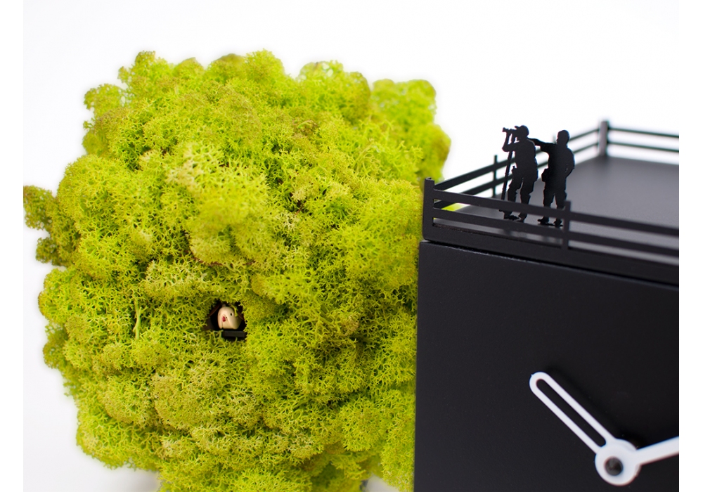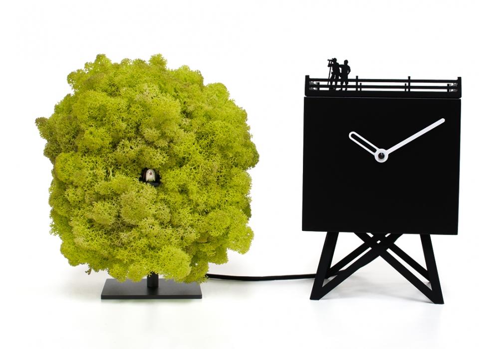 Birdwatching firmato da Studio Kuadra per Progetti è un orologio a cucù da tavolo con casetta di avvistamento in legno, dove sono posizionate due sagome, e "l'albero" dove alloggia l'uccellino è realizzato in lichene stabilizzato utilizzabile in ambienti interni privi di illuminazione naturale senza subire variazioni. Il movimento a cucù, di progettazione tedesca, è di alta qualità ed è alimentato da due batterie, ha un sensore fotosensibile che non lo fa cantare quando è buio. Una pulsantiera permette di regolare l'intensità del suono o di spegnerlo del tutto. Disponibile in diverse finiture.