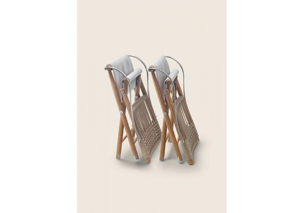 Lauren Outdoor firmata da Antonio Citterio per Flexform è una poltroncina con struttura pieghevole in legno massello di iroko, schienale intrecciato in cordoncino in polipropilene opaco e parti metalliche nelle finiture brunito, spazzolato opaco o titanio opaco 710. Seduta in tela sfoderabile idrorepellente e antimacchia nel colore Dune 9720.