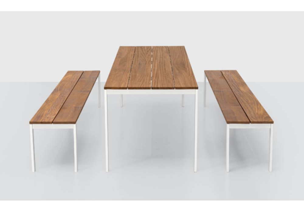 Be-Easy Slatted firmata da Bluezone per Kristalia è una panca per esterni con gambe in acciaio e seduta a doghe in alluminio o teak. Disponibile in diverse finiture e dimensioni.