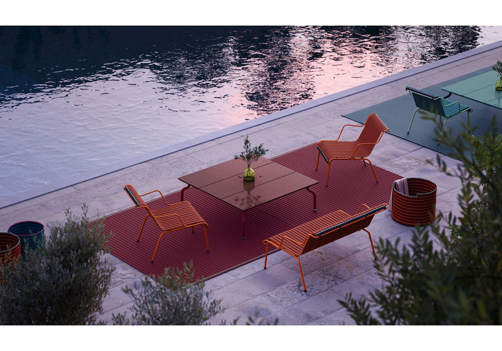 South firmata da Konstantin Grcic per Magis è una panca realizzata in tubo e tondino di acciaio trattato cataforesi e verniciato poliestere. Piedini orientabili. Possibilità di aggiunta di stuoie intrecciate.