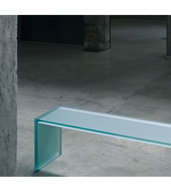 Triennale firmata da Michele De Lucchi per Glas Italia è una panca in cristallo acidato, in cristallo diffusore colorato opaco o in cristallo diffusore colorato lucido stratificato, da 30 mm di spessore (15+15), molato filo lucido.
