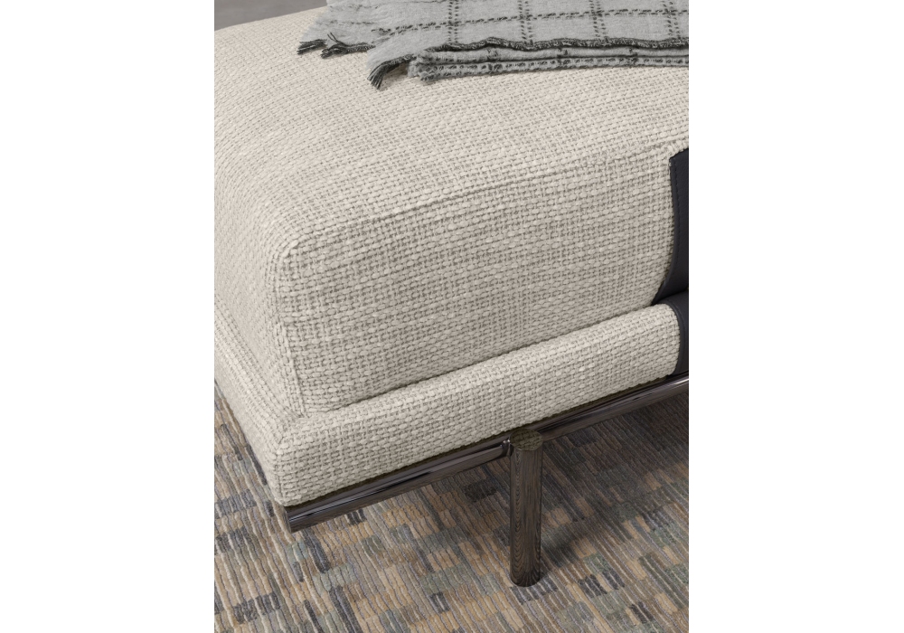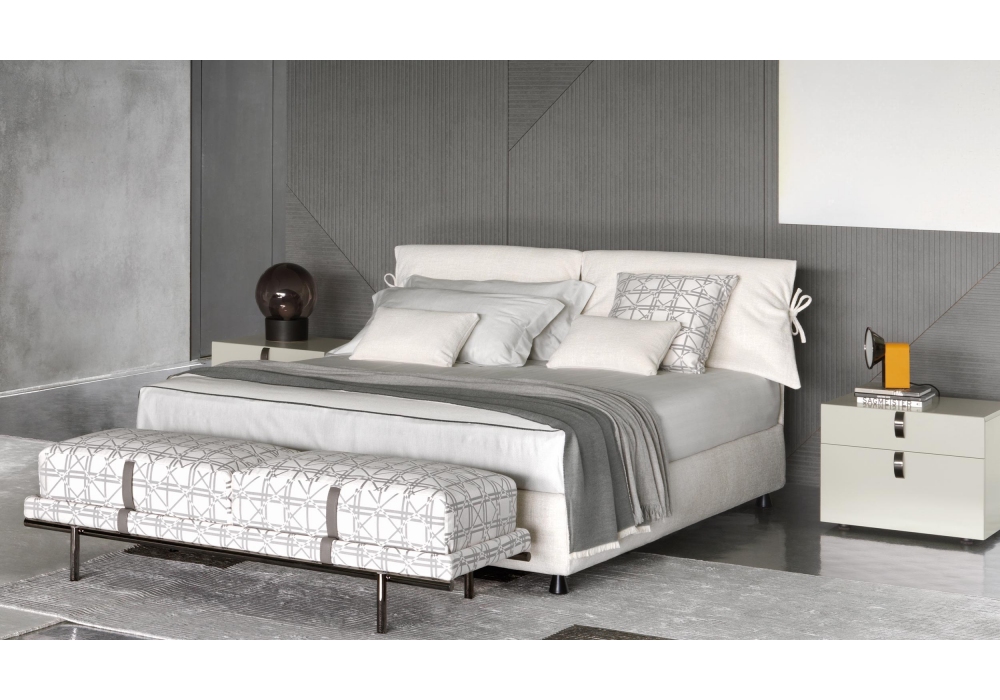 New Bond firmata da Matteo Nunziati per Flou è una panca imbottita con struttura in metallo e gambe cilindriche nelle finiture brunito opaco o nichel nero lucido. Rivestimento in tessuto o pelle con cinghie in pelle.
