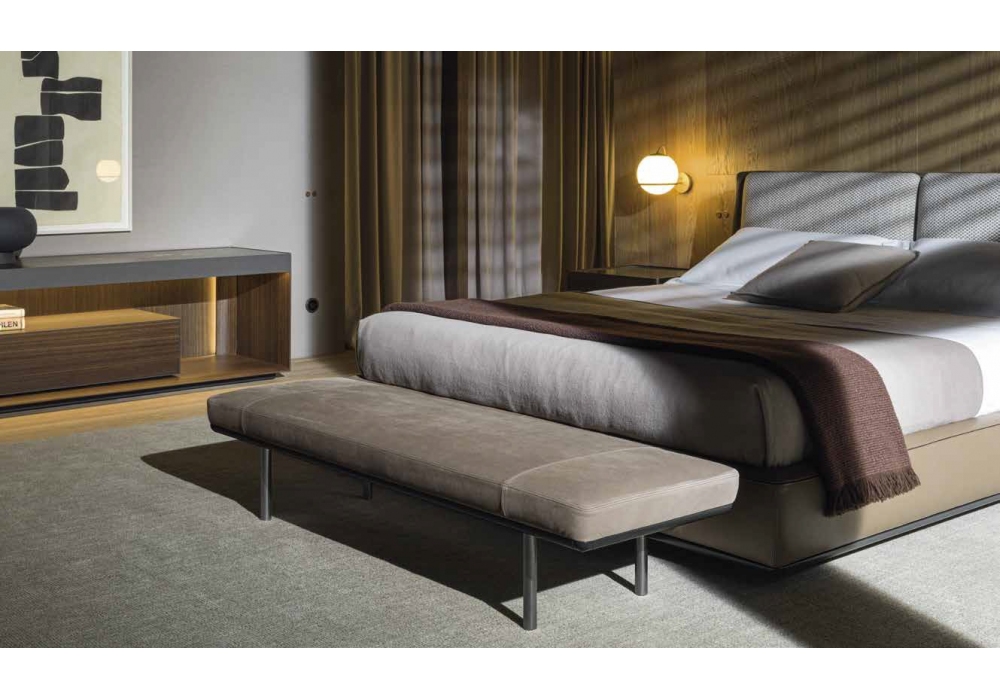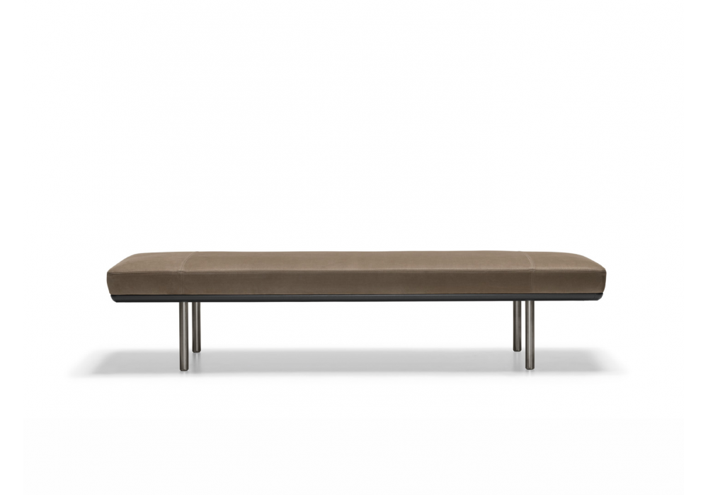 Aldgate firmata da Rodolfo Dordoni per Molteni&C è una panca realizzata con piano in pannello di fibra a media densità con imbottitura in poliuretano espanso e rivestimento in tessuto o in pelle. Profili inferiori perimetrali in estruso d’alluminio verniciato e piedi in alluminio con appoggi a terra in materiale plastico antiscivolo.