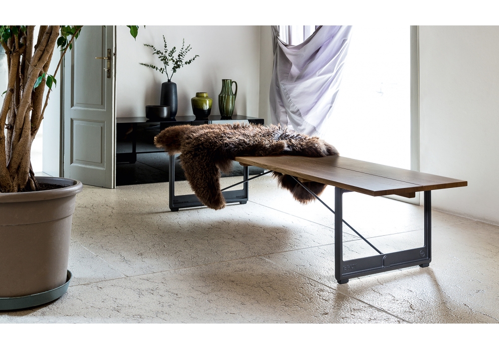 Brut firmata da Konstantin Grcic per Magis è una panca con struttura in ghisa verniciata, seduta in massello di rovere naturale. Disponibile in diverse finiture e due dimensioni.