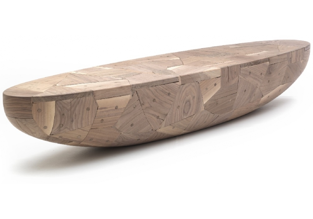 Poh (Patchwork oval hemisphere) firmata da Raphael Navot per Cappellini è una panca ottenuta dal patchwork di pezzi di legno massello in noce americano naturale.