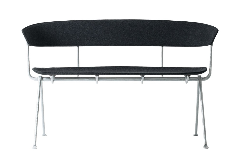 Officina firmata da Ronan & Erwan Bouroullec per Magis è una panca con struttura in ferro forgiato, zincato a caldo o verniciato poliestere, sedile e schienale in multistrato rivestito in tessuto.