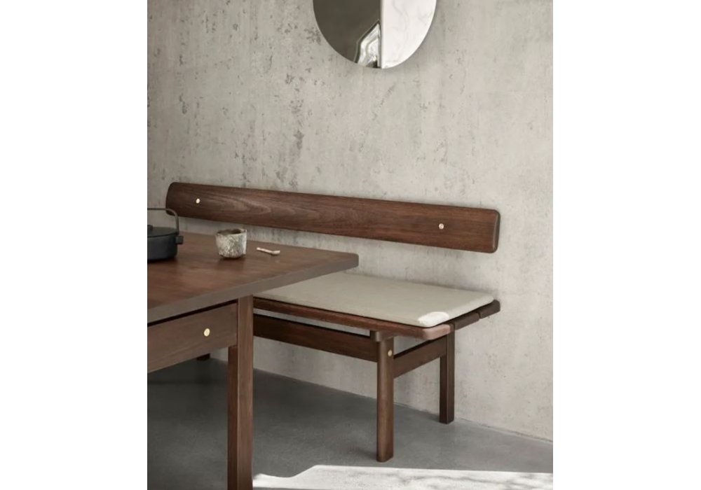 BM0700 Asserbo firmata da Børge Mogensen per Carl Hansen & Søn è una panchina in legno massello di eucalipto trattato a olio scuro. É possibile aggiungere un cuscino di seduta con rivestimento in diversi colori. Lo schienale (BM0701), da fissare a una parete, è nella stessa finitura della panchina.