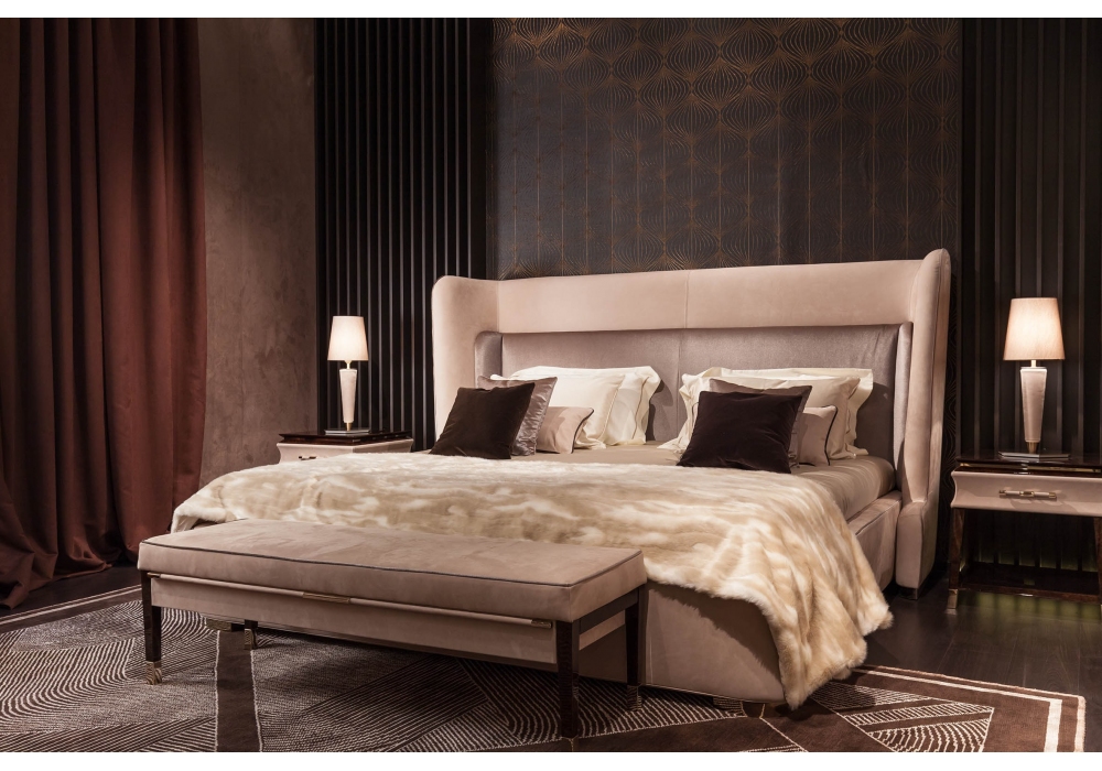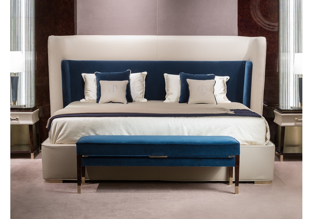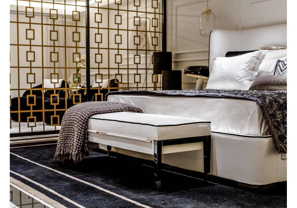 Noir firmata da Andrea Bonini per Turri è una panca con gambe in multistrato e legno massello in finitura poliestere lucido decorato a mano. Cuscinatura in poliuretano espanso con rivestimento in differenti tessuti o pelli. Parti metalliche in finitura oro chiaro o bronzo.