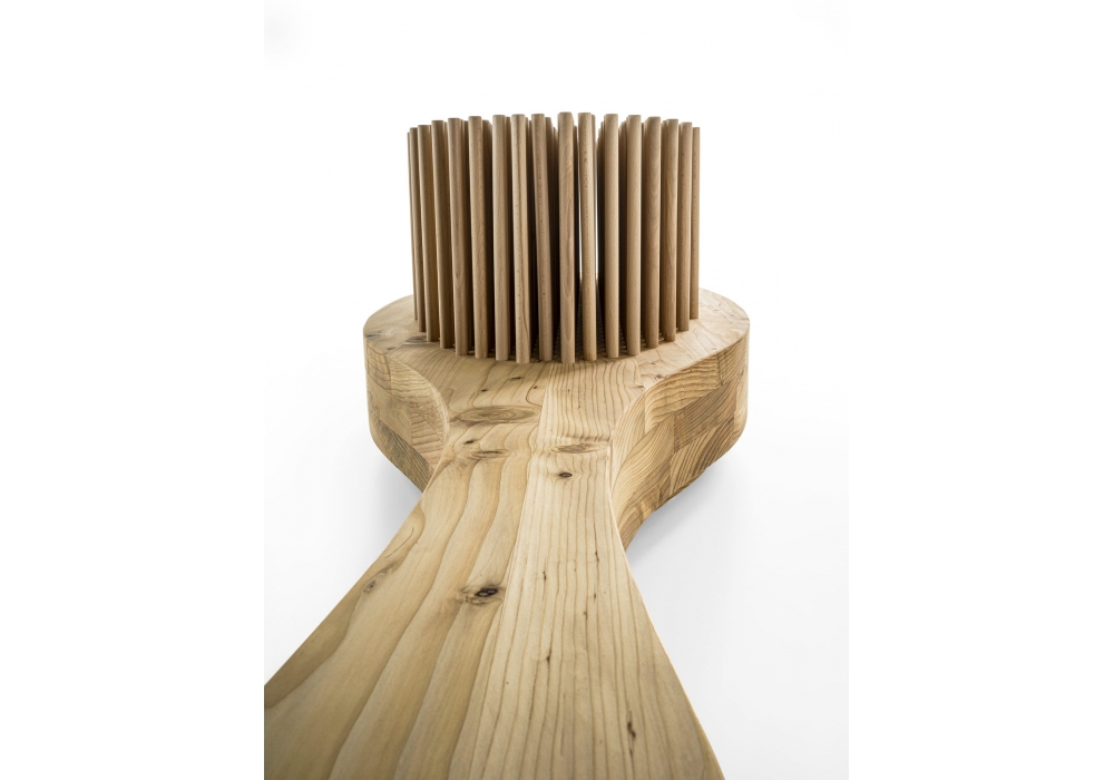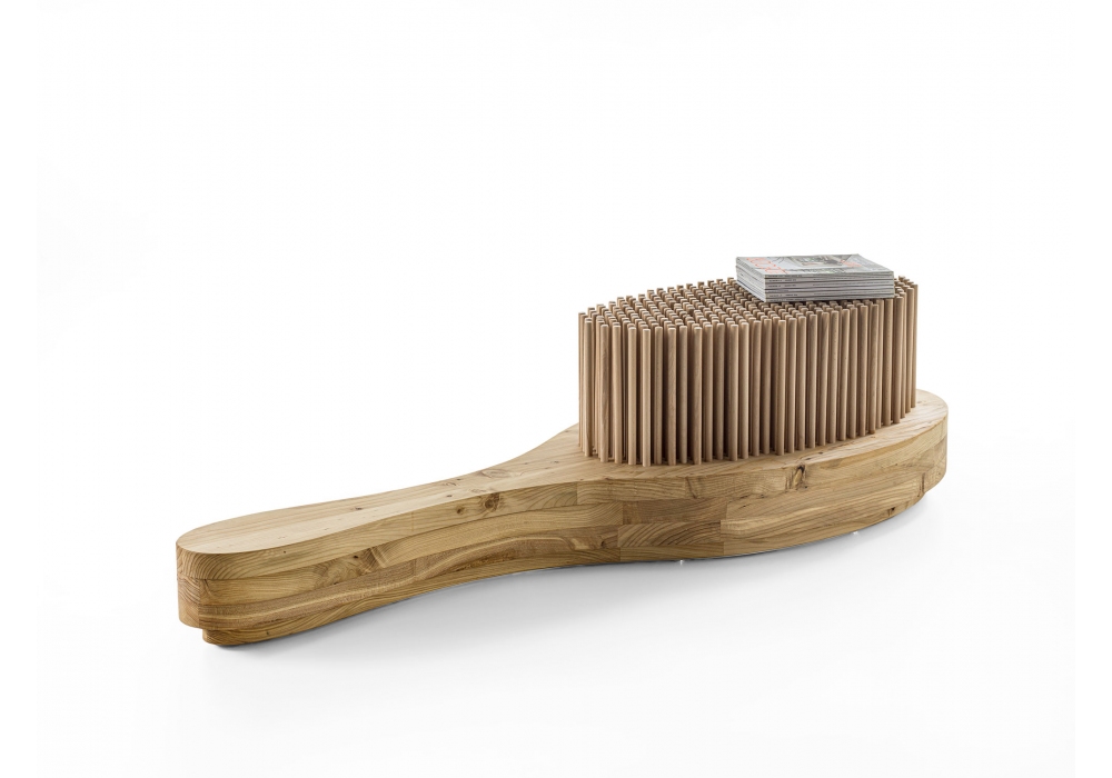 Audrey firmata A.C. Design per Riva 1920 è una panca in legno massello di cedro profumato che prende nome ed ispirazione dalla famosa spazzola di Aldo Coppola.