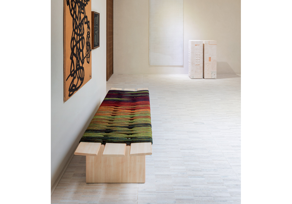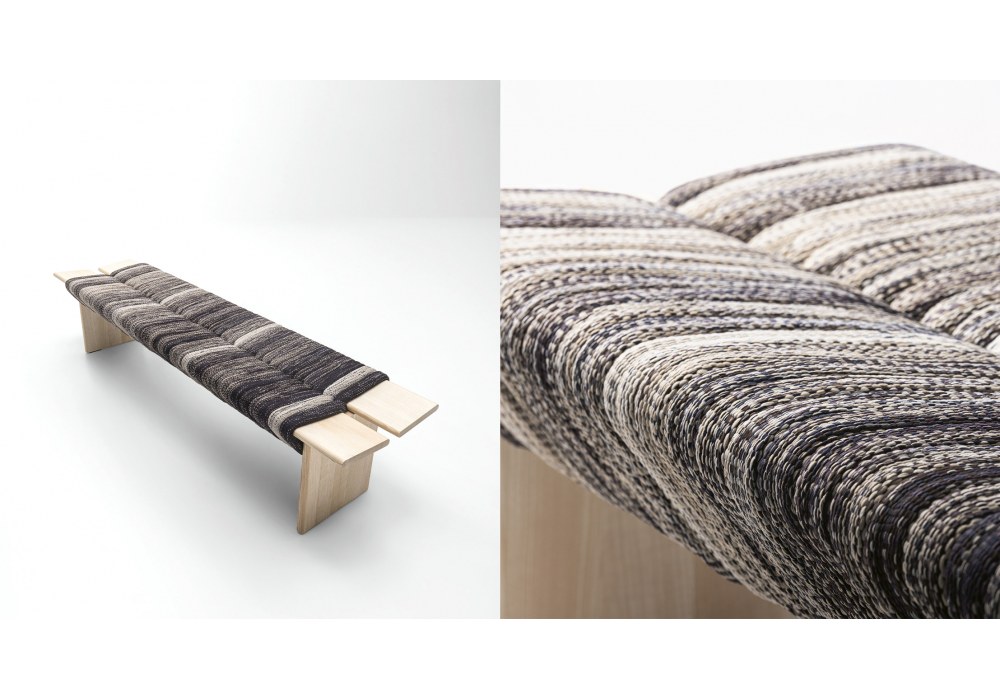 Naga firmata da Atelier Oï per Paola Lenti è una panca con struttura in legno massello di frassino naturale. Rivestimento seduta realizzato con una sequenza di anelli in maglia mélange in poliestere inseriti sulla struttura in modo da generare imprevedibili effetti cromatici.