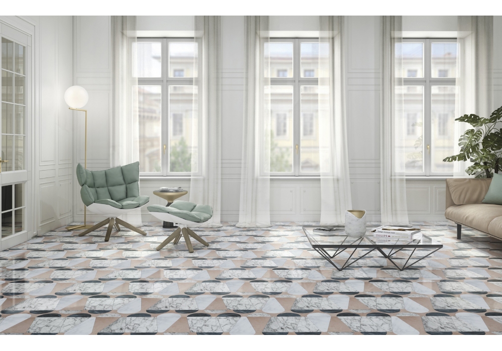 Cône firmato da Patricia Urquiola per Budri è un pannello decorativo modulare da parete o da terra realizzato in Grigio Bardiglio, Rosa del Portogallo Salmone, Statuarietto e Calacatta.
