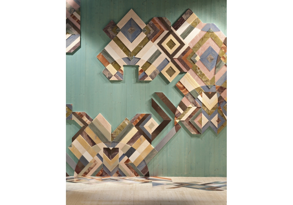 Earthquake firmato da Patricia Urquiola per Budri è un pannello decorativo da terra/parete realizzato con frammenti di marmo e pietre semipreziose, provenienti dalle lastre danneggiate dal sisma. Preziosi marmi e onici intervallati da geometrie in resina color mandarino formano un ampio decoro ad effetto lenticolare. Parte dell’intarsio scivola a terra, dove intarsi Kilim confluiscono nel legno.