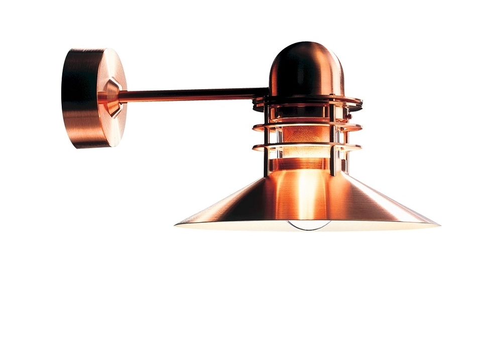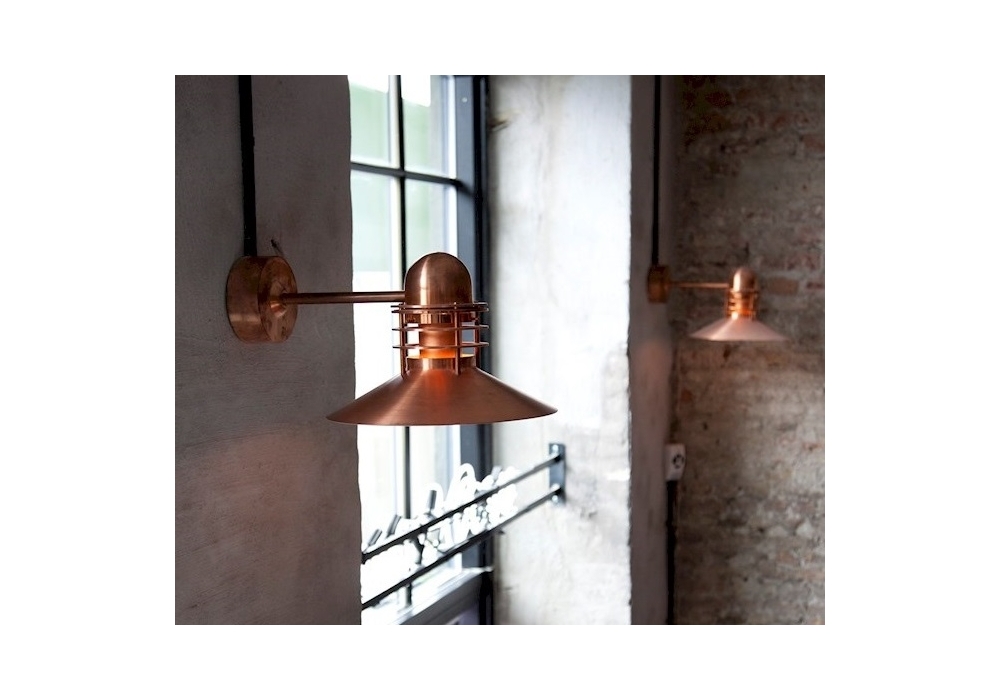 Nyhavn firmata da Alfred Homann & Ole V. Kjær per Louis Poulsen è una lampada da parete per esterni interamente strutturata in alluminio o rame tirato. La sorgente luminosa adottata è con innesto E27 di tipo LED o alogena.
