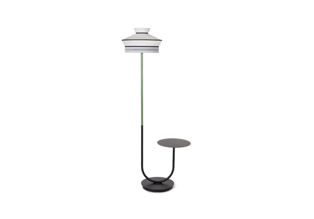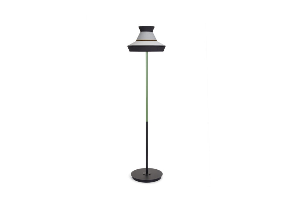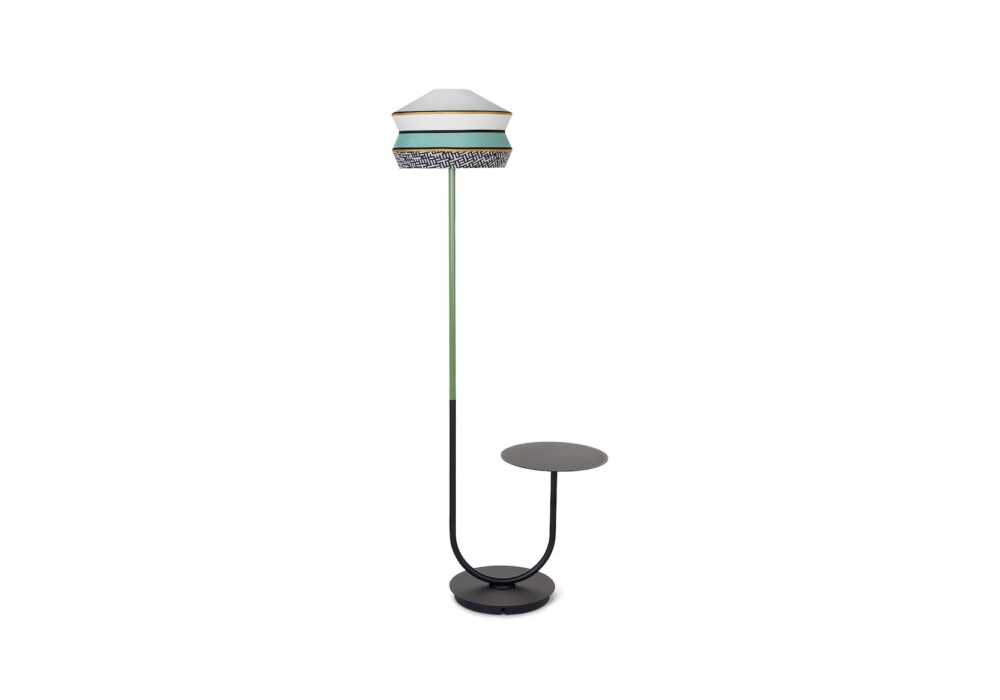 Calypso firmata da Servomuto per Contardi è una lampada da terra per esterni con base circolare ed asta verticale in ottone con la parte inferiore nera opaca e superiore verde reseda. Il paralume è in tessuto di forma circolare ed adotta una sorgente luminosa con innesto E27 di tipo LED. Calypso è disponibile in versione con o senza tavolino e differenti modelli e finiture di paralume.