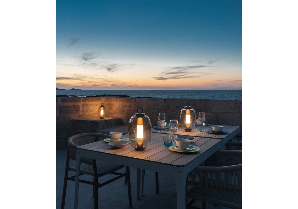 Lucerna firmata da Luca Nichetto per Ethimo è una lampada da tavolo con corpo illuminante in alluminio e diffusore in vetro soffiato trasparente o acidato. Lucerna è disponibile in differenti finiture ed in versione ricaricabile o con cavo.