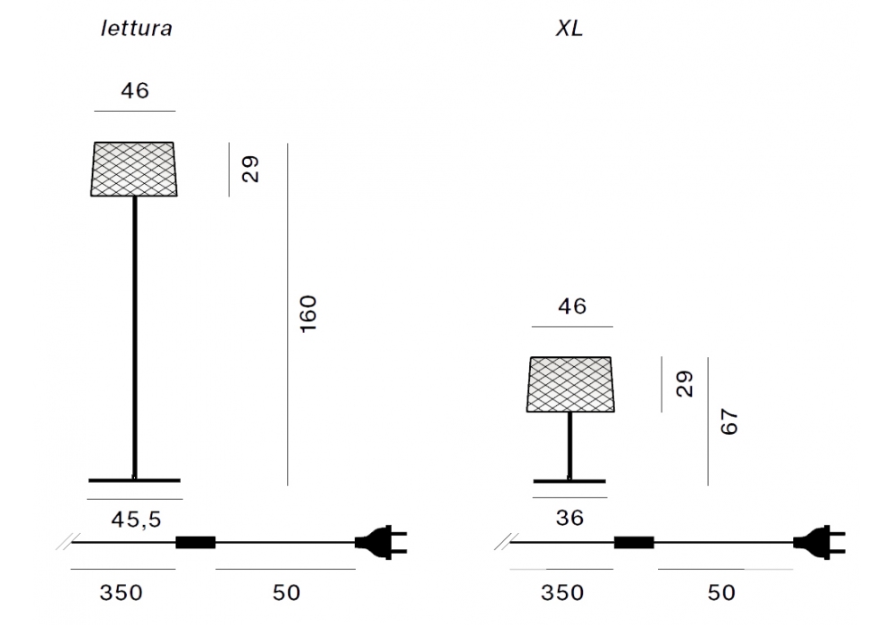 | Dimensioni | Ø 45,5 x H 160 cm (Twiggy Grid Lettura); Ø 36 x H 67 cm (Twiggy Grid XL). |