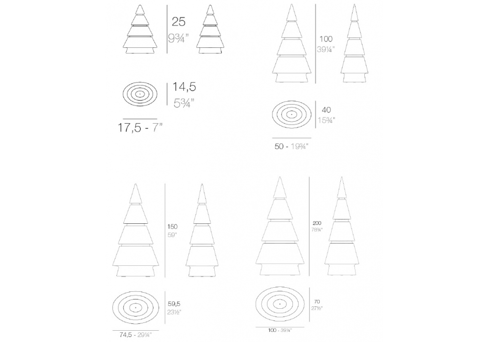 | Dimensioni | NANO_ 18 x 15 x H 25 cm; 100 x 70 x H 200 cm; 75 x 60 x H 150 cm; 50 x 40 x H 100 cm. |