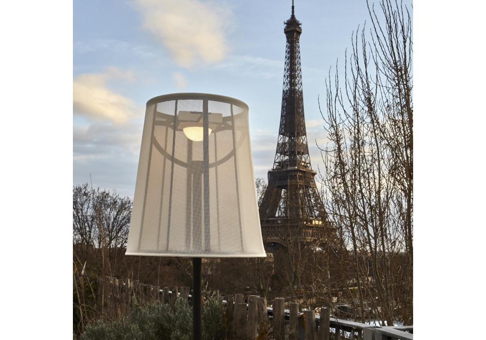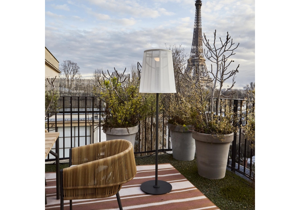 Alone firmata da Ligne Roset è una lampada da terra a LED ricaricabile (a ricarica solare o tramite porta USB) Con il imponente paralume, posto su una base in metallo nero, su una struttura metallica nera, questa lampada è l'accessorio perfetto per gli ambienti esterni nelle sere d’estate, cui conferisce una luce morbida. Struttura in alluminio laccato charbon, paralume Batyline (70% PVC/30% poliestere) colore bianco.