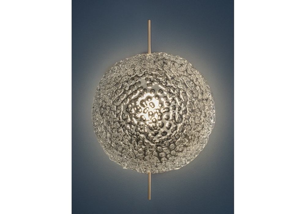 Medousê W firmata da Enzo Catellani per Catellani&Smith è una lampada da parete da outdoor a LED dimmerabile, con la forma di una semisfera in vetro irregolare verde o trasparente. I dettagli sono in ottone.