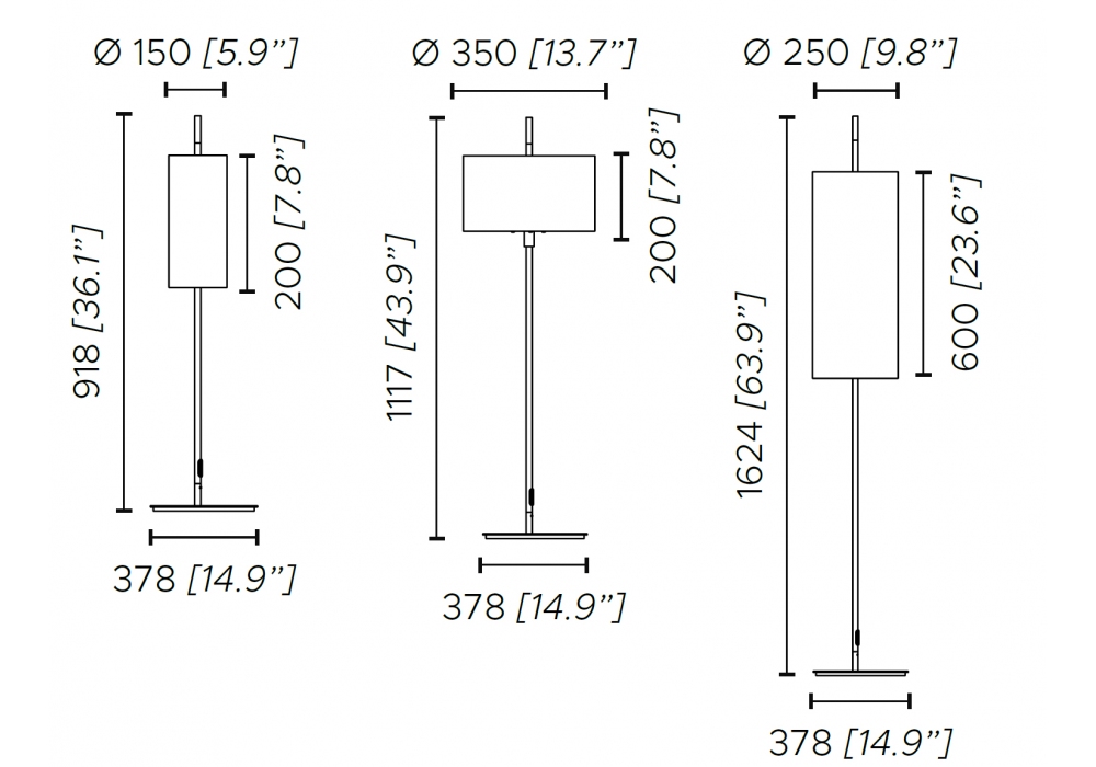 | Dimensioni | Ø 15 x 37,8 x H 91,8 cm; Ø 35 x 37,8 x H 111,7 cm; Ø 25 x 37,8 x H 162,4 cm. |