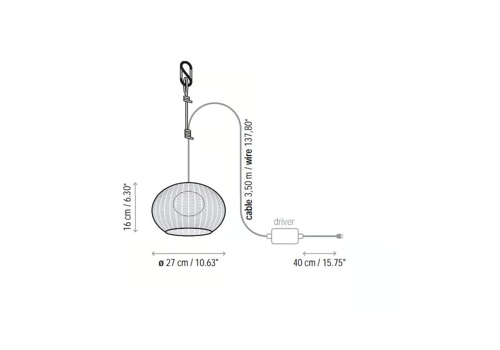 Garota Hang firmata da Alex Fernández Camps e Gonzalo Milà per Bover è una lampada a sospensione per esterni con suporto e struttura portante in metallo verniciato. Il paralume è di forma tondeggiante in fibra sintetica e scherma una sorgente luminosa di tipo LED. Garota Hang è disponibile in differenti finiture.
