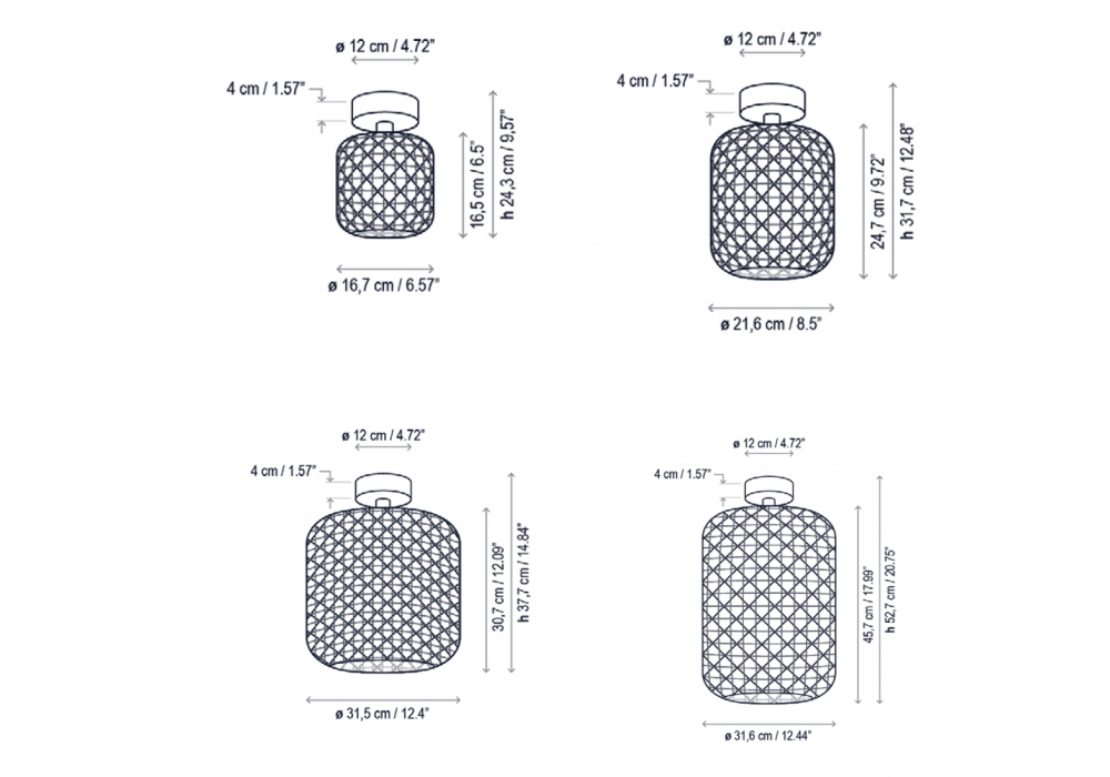 | Dimensioni | Ø 16,7 x H 24,3 cm; Ø 21,6 x H 31,7 cm; Ø 31,5 x H 37,7 cm; Ø 31,6 x H 52,7 cm. |