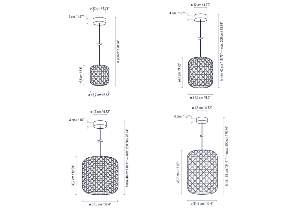 | Dimensioni | Ø 16,7 x H 16,5 cm Hmax 200 cm; Ø 21,6, x H 24,7 cm Hmax 200 cm; Ø 31,5, x H 30,7 cm Hmax 200 cm; Ø 31,5, x H 45,7 cm Hmax 200 cm. |