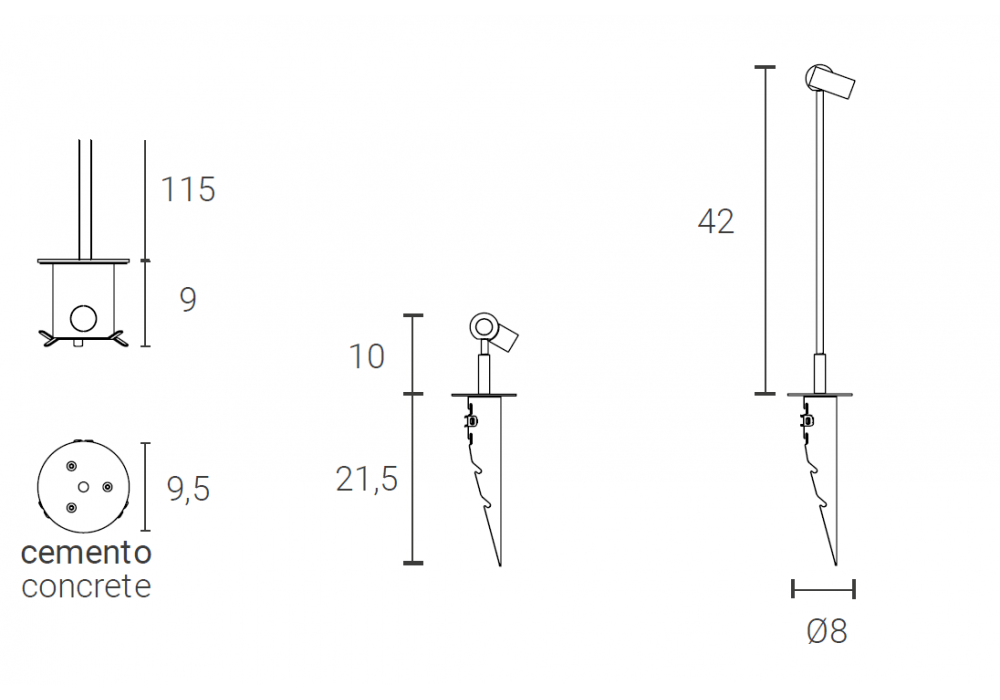 | Base | Outdoor Floor_ Ø 8 x H 21.5; Concrete Floor_ Ø 9.5 x H 9 cm. |