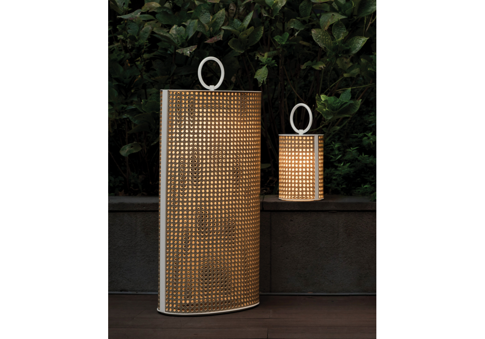 Clara firmata da Chiara Caberlon per Contardi è una lampada da esterno con diffusore in resina effetto paglia di Vienna e struttura in crema o bronzo, è resistente agli agenti esterni e ai raggi UV. Cavo nero fornito con connettore IP68 per esterni.