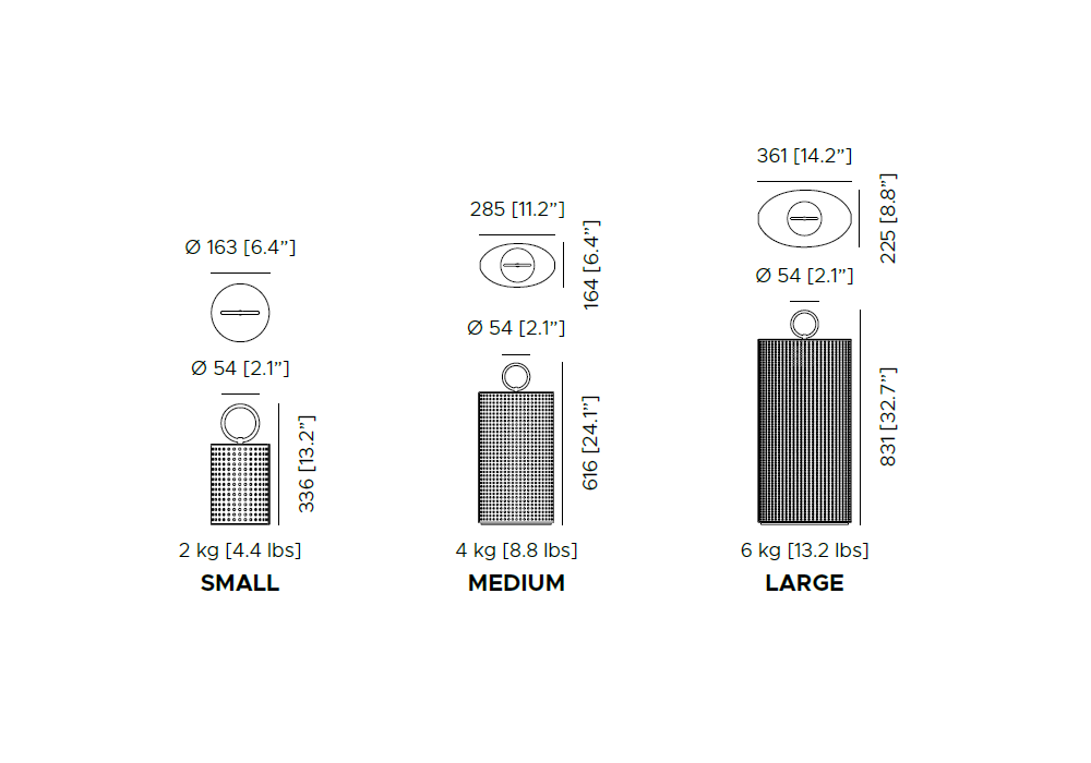 | Dimensioni | Small_ Ø 16.3 x H 33.6 cm; Medium_ 28.5 x 16.4 x H 61.6 cm; Large_ 36.1 x 22.5 x H 83.1 cm. |