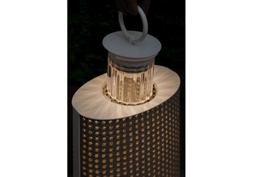 Clara Nomad firmata da Chiara Caberlon per Contardi è una lampada da esterno con diffusore in resina effetto paglia di Vienna e struttura in crema o bronzo, è resistente agli agenti esterni e ai raggi UV. Dotata di modulo LED, offre un’autonomia fino a 10 ore. Si ricarica in 6–8 ore tramite cavo USB-C (incluso). Alimentatore non fornito.