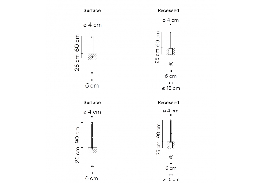 | Dimensioni | Ø 4 x H 60 cm; Ø 4 x H 90 cm. |