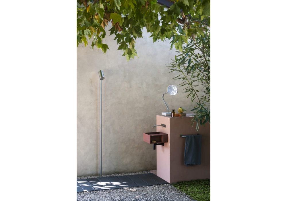 Petra firmata da Diego Vencato e Marco Merendi è una pedana per doccia da esterno realizzata da doghe in Cementoskin® o in marmo, raccolte da un profilo perimetrale in acciaio inox completo di ancoraggi per il fissaggio al suolo.