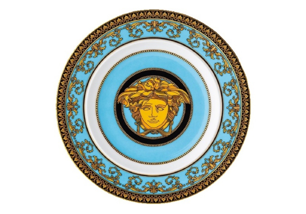 Medusa Celeste firmato da Versace in collaborazione con Rosenthal è un piatto piano in porcellana.