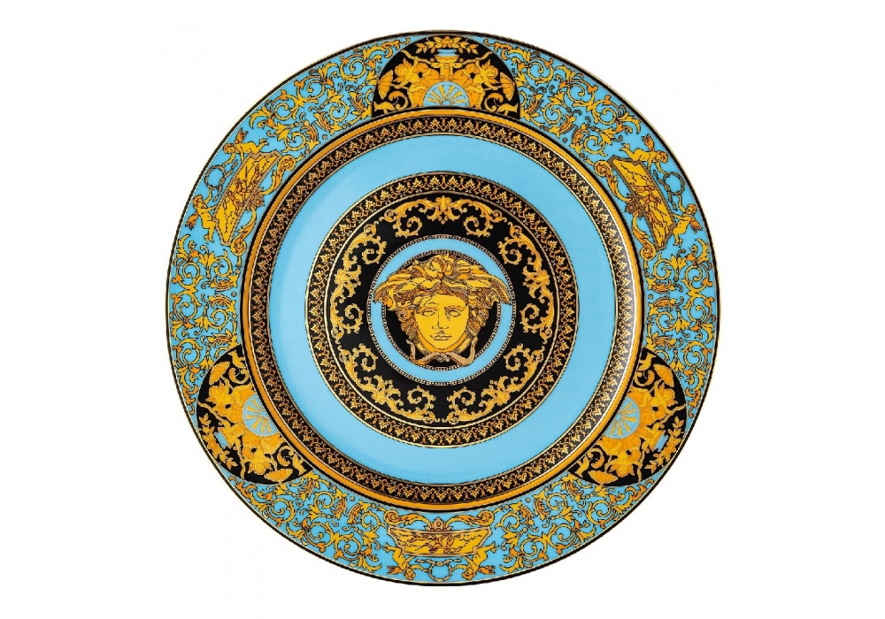 Medusa Celeste firmato da Versace in collaborazione con Rosenthal è un piatto segnaposto in porcellana o da parete.