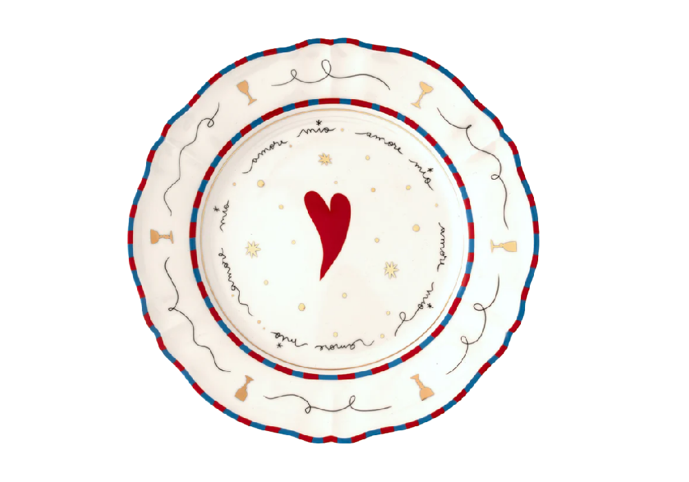 Cuore firmato da design Pangea per Bitossi Home è un piatto piano in porcellana con decorazioni e dettagli in oro. Adatto alla lavastoviglie e a un massimo di 250 lavaggi. Non adatto al microonde.