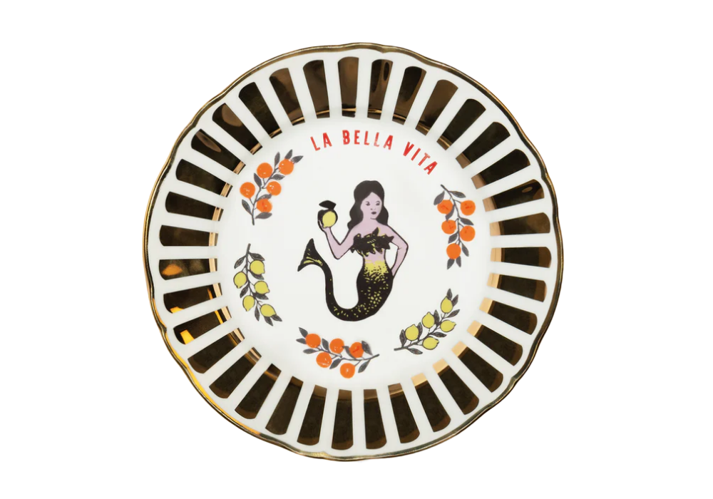 Sirenetta firmato da design Sam Baron per Bitossi Home è un piatto frutta realizzato in porcellana con decorazioni e dettagli in oro. Adatto alla lavastoviglie e a un massimo di 250 lavaggi. Non adatto al microonde.