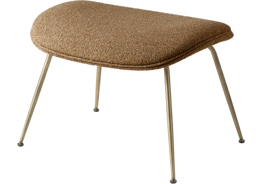 Beetle firmato da GamFratesi per Gubi è un poggiapiedi con gambe in acciaio verniciato a polvere nero o ottone. Rivestimento disponibile in diversi tessuti o pelli.